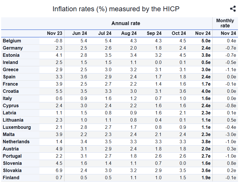 Годишната инфлация в еврозоната се ускорява до 2,3% през ноември 2024 г.