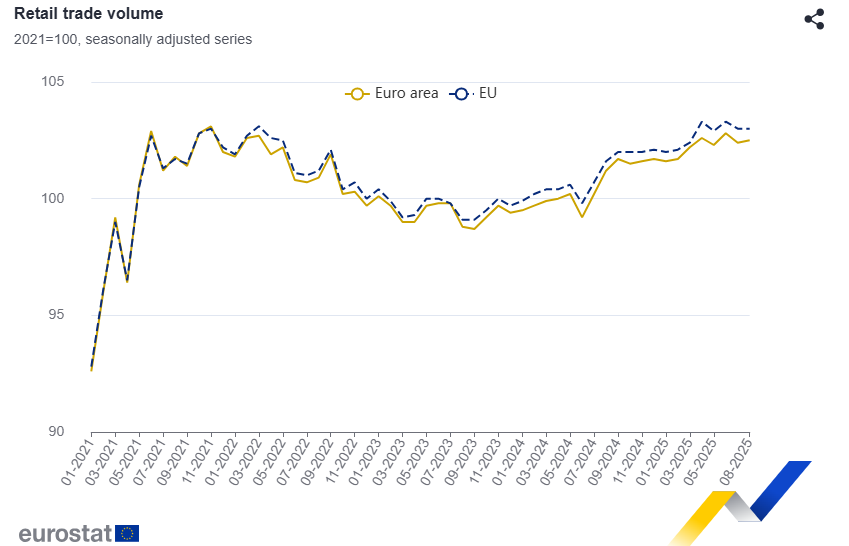През август 2025 г. в сравнение с юли 2025 г. сезонно коригираният обем на търговията на дребно е останал без промяна в ЕС и се е увеличил с 0,1% в еврозоната, показват първите оценки на Евростат. През юли 2025 г. обемът на търговията на дребно е намалял с 0,3% в ЕС и с 0,4% в еврозоната.