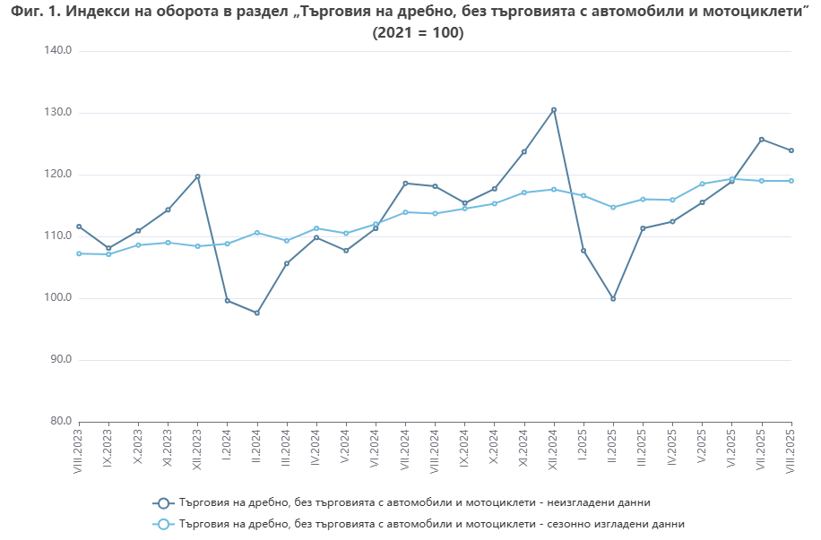 През август 2025 г. оборотът в раздел „Търговия на дребно, без търговията с автомобили и мотоциклети“ по съпоставими цени запазва нивото си от предходния месец, показват предварителните и сезонно изгладени данни на НСИ.