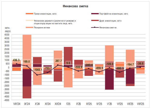 Финансовата сметка за август 2025 г. е отрицателна в размер на 36,8 млн. евро при положителна стойност от 436,3 млн. евро за август 2024 г. За януари – август 2025 г. финансовата сметка е отрицателна – 2 428,9 млн. евро (2,2% от БВП), при положителна стойност от 549,2 млн. евро (0,5% от БВП) за същия период на 2024 г.
